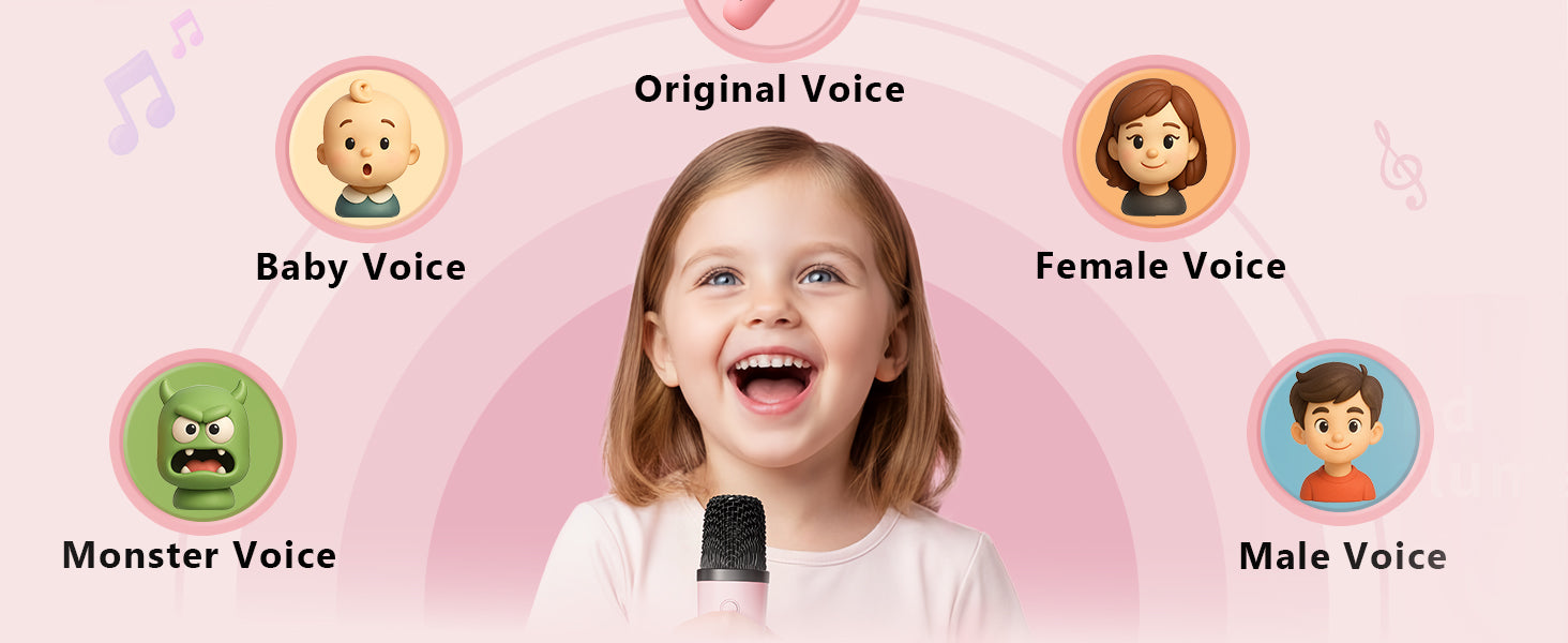 - [Multi Function Karaoke Machine] - 5 magic voices (Male Voice , Female Voice , Baby Voice , Monster Voice , Original Voice) plus one-tap Vocal On/Off to switch between original vocals and instrumental. Rear 3.5 mm headphone jack lets kids practice quietly. Fun kids toys and top children gifts.