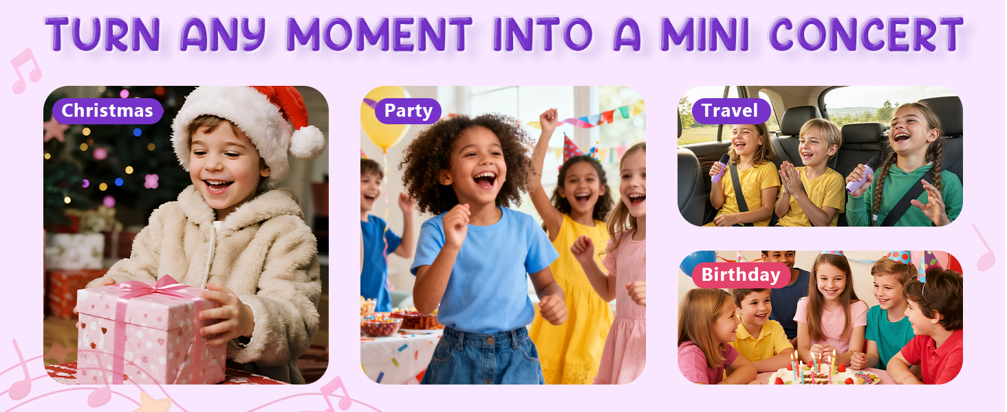 - [Cute & Compact] - This wireless karaoke microphone fits in your backpack,Comfortable handle sized for small hands; quick move from bedroom concerts to backyard dance-offs, This portable Bluetooth speaker and kids karaoke machine for Parties,Birthday , Meeting, Classroom, Family Activities, toys for girls/boy—fun without the bulk.